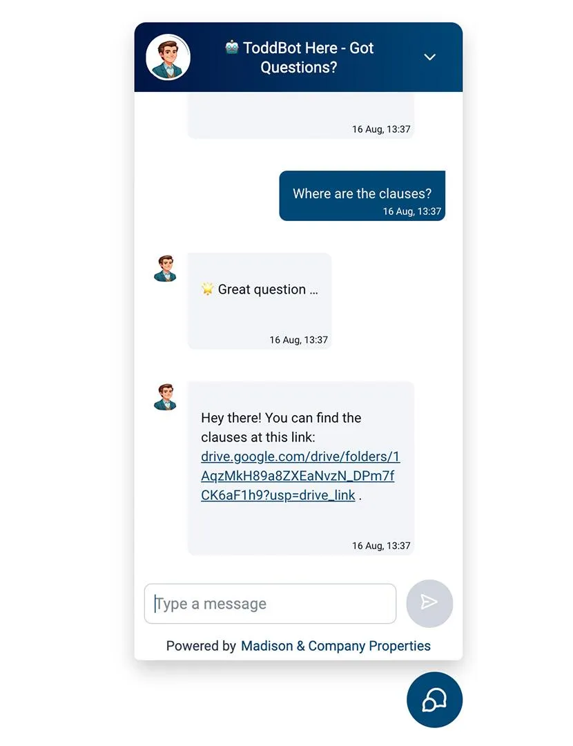 Todd Bot is our helpful AI chatbot designed to assist agents in finding assets and navigating the Madison Hub. Todd Bot was created to represent our broker owner to simplify the day-to-day tasks for our agents, making it easier for them to find the resources they need and navigate the Madison Hub with ease.